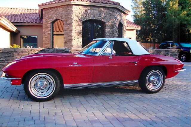 This is a VERY nice Stingray Convertible! It is a low mile vehicle that was completely restored and has just finished being refreshed. It is powered by a high performance 327/365hp V-8 engine with a 4- speed transmission and posi-traction rear end. Complimenting options include Leather interior, am-fm radio, and "Knock Off" style wheels and radial tires. The original trim tags suggest that this car came from the factory new finished in "Tuxedo Black" and is also believed to be an original "Fuel Injection" car. It is now finished in Riverside Red with Black leather interior and White soft top and looks, runs and drives excellent and is ready to show, drive and enjoy. You would be hard pressed to find a better car!