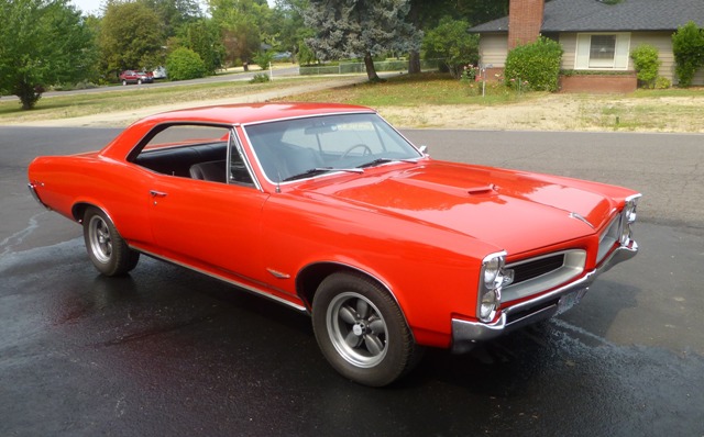 1966 Pontiac GTO tribute car Originally a Tempest but was restored with 421 V 8 Engine , tri-power intake with 3 2 bbl carbs, Muncie 4 speed, console & bucket seats, 3.55 positraction, NuVintage gauges, custom wheels and dual exhaust. Torch red paint, black vinyl interior.