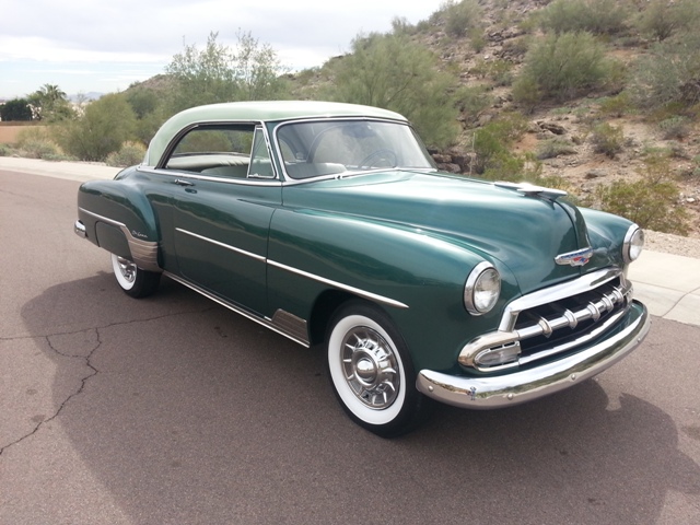 1952 Chevrolet Styleline Deluxe Belair - 2 Door Hardtop - Custom RestoMod - 235 CI -5 Speed Manual Transmission - Razor Straight Frame Off Restoration - This stunning 1952 2 door hardtop Styleline Deluxe Belair Custom Restoration is arguably one of the most beautifully restored 1952s in existence today. This striking, no excuses and flawless Belair Deluxe has razor straight body lines with a fresh and complete full frame- off restoration demonstrating exceptional detail and craftsmanship. TOTALLY RUST FREE with all original no-hit body panels and flawlessly refinished in its original color combination. The expert workmanship of the restoration is demonstrated in every detail. With new paint, new interior, all new and restored mechanicals, one- off custom Dakota Digital dash and meticulous attention to detail, this Styleline Deluxe Belair has been driven less than 100 miles since its total restoration. With over $50,000 invested in this car, over $12,000 was invested in the custom interior alone. As pristine and perfect is the presentation, this car runs and drives as good as it looks. • 235 CI Inline 6 Engine • 5 Speed Manual Transmission • Wide White Wall Tires • Custom Cadillac Eldorado Bullet Full Cover Hubcaps • Bench Seat with Floor Shifter • Custom High End Interior • Custom Dakota Digital Dash • Electric Windshield Wipers • Custom Trunk Upholstery • Working Factory Clock • Deluxe Steering Wheel • All New/Restored Chrome and Glass • A/C Compressor Provisioned for Vintage A/C and Heater System