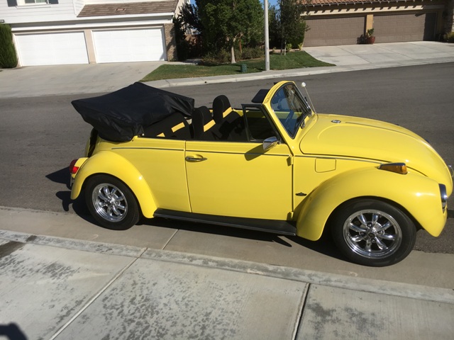 This convertible beetle has been beautifully custom restored using many of the factory options with modern custom upgrades. The body had had some nice mild custom modifications which include the custom shaved rear deck lid, custom all steel rear apron, custom all steel front apron and custom chrome bumper blades front and rear. The headlights have been upgraded and have integrated yellow fog lights. The black convertible top is in excellent condition. The motor is a professional build 1776cc with an upgraded turbo. 4-speed with a short throw shifter. The suspension has been lowered 2” and has Empi Alloy wheels and new 15” tires.