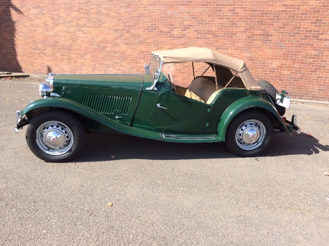 This British racing green MG TD has a wonderful new canvas top and side curtain and nicely done interior. This freshly tuned 1.3 Liter 4-cylinder effectively moves this cute roadster while effortlessly shifting through the 4-speed manual transmission. With functional gauges, nice chrome and a lustrous finish this is a car not to pass up.
