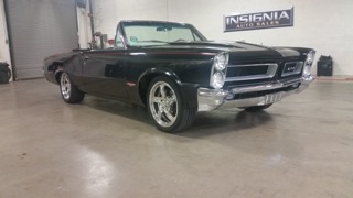 1965 Pontiac Le Mans Convertible ‘GTO’ Tribute in triple black, Black canvas Rag Top; Powered by legendary 400 cu.in. big block V8 with Edelbrock aluminum Intake and 4BBL Carb; TH400 Trans; custom silver stitched black bucket seats; center console with floor shifter, power front disc brakes, 18” X 8” Bonspeed Polished Alloy Wheels, Magn-a-flow Dual Exhaust ;check out the Dual “Ram Horn” air cleaner under the hood. This amazing “clone” is well sorted and begs to be cruising, a real nice driver with plenty of room for the clubs in a fully carpeted trunk space.