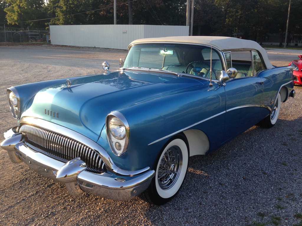 1954 BUICK SKYLARK - # 299 OF 836 - RUNS AND DRIVES WELL, EXTENSIVE OWNER HISTORY AND DOCUMENTATION, 836 SKYLARKS PRODUCED, RECENTLY PURCHASED FROM A NATIONAL BUICK CLUB MEMBER, KNOWN CAR IN THE SKYLARK REGISTRY, ORIGINAL PAINT CODE IS 11, TRIM NUMBER 67, WHITE CONVERTIBLE TOP, DIAMONDBACK TIRES, ELECTRIC FUEL PUMP, POWER ANTENNA WORKS, NICE WIRE WHEELS, ORIGINAL BODY TAG, CORRECT VIN FOR SKYLARK, ORIGINAL 1954 INSPECTION STICKER FOR GLASS, CORRECT JENKINS LEATHER INTERIOR W/EMBOSSED SQUARES.