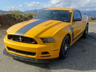 2013 Mustang Boss 302 Laguna Seca - LIMITED EDITION LEGUNA SECA NUMBER LS 738 - Finished in School Bus Yellow with Gray Metallic Strips (Boss exclusive). Charcoal black cloth interior with Recaro seats (Rear seat delete Boss exclusive). Includes all owner installed Laguna Seca parts. Brake cooling ducts, trans cooler scoop, front splitter (generates 90 lbs. of down force at 140 mph). 444 hp 5.0 Liter Coyote Small Bock (Only major component shared with the standard GT 5.0 Liter is the block). 6 Speed Transmission, 3.73 Limited Slip Rear End. Sale includes two sets of rims and tires, the original rims mounted with the original Pirelli Pzero tires and a second matching set of Ford Racing rims mounted with BFGoodrich G-Force Sport Comp-2 tires. Trackey (Red Track Only Key), 2 Boss 302 OEM car covers, Original window sticker, Original bill of sale, Original Ford Boss 302 owner promotional material. Owned since new by two car loving brothers, respected, enjoyed, and maintained with pride. Ford Motor Company, April 2010 (Laguna Seca Press Release) "The Boss is Back. Building on the spirit of the 1969 Boss 302, one of the most sought-after examples of American Performance in the world, the ground-breaking GT has been distilled to it purest form. Every component has been examined, each system strengthened and refined. The result is the Modern Mustang Boss 302, a street-legal race car destined to be America’s next performance legend.” Car and Driver, September 2012 "The Laguna Seca spin-off didn’t happen by magic. Ford has dutifully honed the Mustang’s anachronistic suspension setup, powertrain lineup, and aesthetics for the past few years. The Boss 302 Laguna Seca wraps you in a big, fuzzy bear hug of stupidly capable acceleration, cornering, and braking ability. Frankly, the car as a whole is tremendous, and one of the best available today. All hail the bossiest of Bosses.”