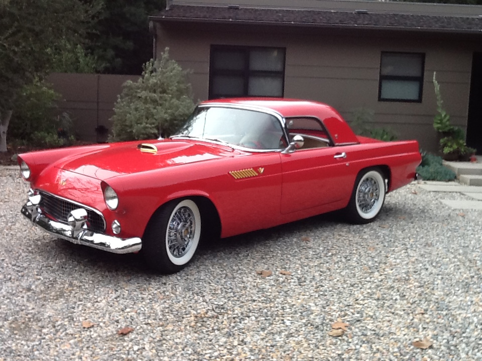 1955 Ford Thunderbird with hardtop A great looking car you can be proud to drive & enjoy Features high quality bright red finish with re chromed bumpers, wire wheels & fender skirts Just out of 10 yr storage in a dry S CA garage. New WWSW tires, battery & high capacity radiator 12 volt conversion, updated Holly carb & dry type air cleaner. Strong engine, automatic transmission, power steering, power brakes & power seat. Custom light tan leather interior + AM/FM radio. . Includes front disk conversion kit in the box ready to install. Sheet metal panels are exceptionally straight . Prior S CA owner indicates car was totally restored.