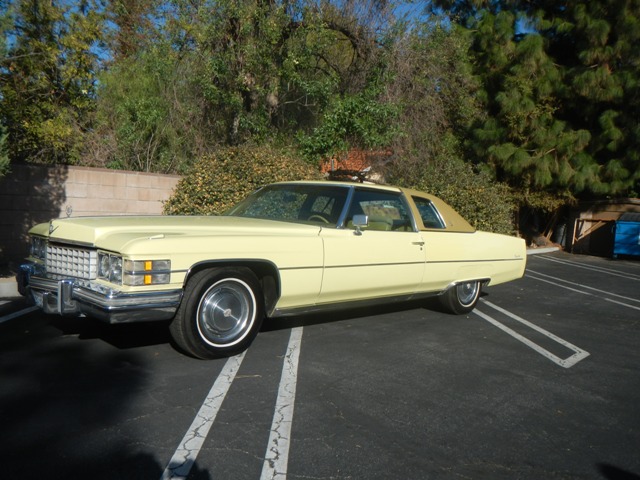 1974 Cadillac Coupe Deville, An original Southern California Example Sold new at Modern Motors in Glendale Ca. with only 92000 Miles on this car it has lots of life left in her. Excellent yellow paint with no major blems, good shine, very straight with no rust issues like the salted roads of the east coast cars, Nice weather striping throughout the vehicle, nice top, good and complete stainless and chrome trim with high luster, doors, hood and truck align nicely. The leather interior is also in wonderfull shape, no tears, to the headliner, cracks to the dash, AM Fm Stereo is working along with all of its power items, Gunsghts for signals working, AC also just done, suspension, motor and trans all in good condition, no leaks.