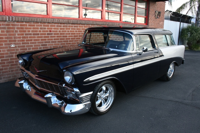 Beautifully executed professionally restored 1956 Nomad wagon. Less than 4500 miles since a complete body off custom build. All of the best components were used starting with a fully boxed and powdercoated frame and suspension. Rear end is a Ford 9" with Cal trac bars. Front end has a heavy duty sway bar and C4 Corvette disc brakes. Brake power is supplied by a powerful "hydroboost" power braking system. Power comes from a Chevrolet ZZ4 350 cubic inch crate engine boasting 400hp with electronic fuel injection, aluminum heads, serpentine belt system, and custom 2-1/2 inch dual exhaust. 700R4 automatic overdrive transmission allows for comfortable highway cruising speeds. Custom paint and body in a gorgeous Ferrari Deep Blue with Silver Quarters. All chrome and stainless was refinished to show quality. All glass and weatherstripping was replaced and is excellent. Custom interior with 6 way power bucket seats and console. Classic Instruments gauge cluster, tilt column, smaller diameter steering wheel, power windows, and custom autosound stereo with CD changer. This car is equipped with Vintage Air AC and heat. Extra sound deadening and insulation was used to create a very comfortable and quiet cabin. Over $150,000 invested in this stunning car, it drives as great as it looks.