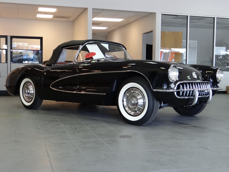 This is an absolutely stunning NCRS Top Flight 1956 Corvette with Onyx Black exterior, Venetian Red interior and black soft-top. This nicely optioned California car has the 225hp dual-quad engine, Powerglide automatic transmission, power windows, Wonder Bar radio, windshield washer system, heater and amp as well as defroster. It is rare to see a ’56 Corvette with the correct early engine components, including the dual-quad carburetors, the rare oil pan with passenger side dipstick, correct ignition shielding, generator mounting bracket and super-rare 2-bolt exhaust manifolds. This car has received an extensive and complete nut-and-bolt, frame-off restoration, beginning with a beautiful rust-free California frame, and pristine body with all original GM fiberglass panels. All chrome and stainless are refinished, polished and stunning. The black body also has black coves, another rarely seen feature. The interior is beautiful Venetian Red in the correct waffle pattern, restored with Al Knoch components, as well as an Al Knoch dated black convertible top. The wonder Bar radio looks and works great with the seek function stopping on AM stations. This beautiful classic 1956 Corvette was presented the NCRS Top Flight award in 2016.