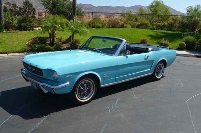 1965 Mustang Convertible - A beautiful “Rust Free” San Jose, California built Mustang convertible. Gorgeous in Tropical Turquoise with Black interior and New White convertible top! Featuring: 289 V-8 (Freshly rebuilt), 4 Speed Transmission, Power Steering, Power top. Exterior decor group, Tinted glass, Styled steel wheels. Beautifully restored! A Wonderful driving, Cute, Fun Classic that will only appreciate…