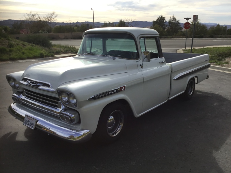 1959 Chevy “Apache 32” custom fleetside big window Presenting a RESTOMOD restoration of the highest caliber! - She rides and drives like a LATE MODEL CADILLAC! - FEATURES: Small block chevy motor, Turbo 350 automatic, Power steering, Power disc brakes VINTAGE AIR CONDITIONING, J.V.C. AM / FM C.D. system, Nova sub frame, Low resistance exhaust system, TUBBED frame and body.