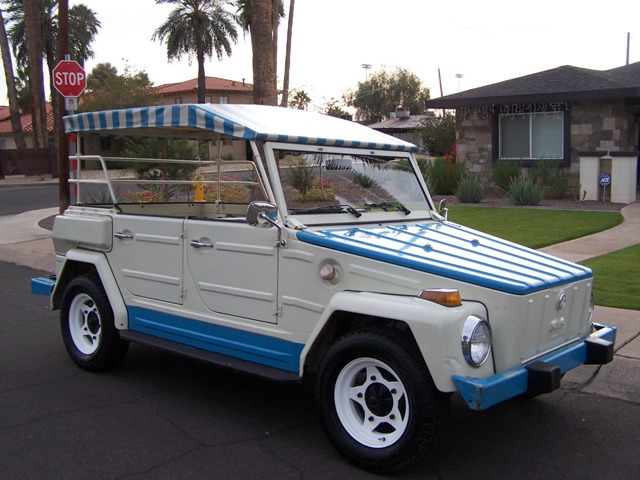 1974 Acapulco Edition Thing Convertible This 1974 Acapulco Edition Thing has ITS ORIGINAL PAINT and panels. It features the original back seat and a reupholstered front seat. The top is new as well. It rides on baja style wheels with new tires. A very clean, nice-driving car, it's powered by a 4-cylinder 1600cc engine with 4-speed manual transmission. Comes with a second top and door inserts. Believe to be original miles of 74,000. Serviced and ready to enjoy. The Acapulco Thing came stock with running boards, special upholstery, special paint scheme, and a choice of three different tops. The choices for Acapulco tops were a surrey top, hard top, or a VW "tan" convertible top. Acapulco side curtains came in VW "tan". The upholstery in an Acapulco’s was striped as well was the material for the surrey top. Hard tops were generally white although a few blue ones were made. The Acapulco model Thing was originally designed for the Las Brisas Hotel in Acapulco, Mexico. It became so popular that the original blue and white paint scheme was exported to the United States. VW also made an orange and white combo, yellow and white combo, and green and white combo.