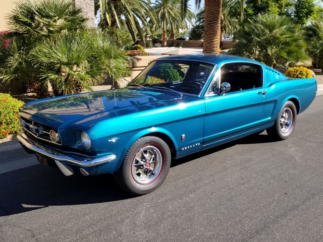1965 FORD MUSTANG 2 + 2 FASTBACK SERIAL NUMBER 5F09C375555 BODY: 63A 2DR FASTBACK WITH STANDARD TRIM COLOR 5: TWILIGHT TURQUOISE TRIM 26: BLACK VINYL DATE 18 M: DECEMBER 1964 AXLE 6: 2:80 TO 1 TRANS 6: C4 AUTOMATIC DSO 41:CHICAGO UPGRADED WITH GT OPTIONS INCLUDING FOG LAMPS, EMBLEMS, PROPERLY INSTALLED FOG LAMP SWITCH, WIRING, AND TRUMPET EXHAUST.OPTIONS INCLUDE AIR CONDITIONING, AUTOMATIC TRANSMISSION WITH CONSOLE, POWER STEERING, FRONT DISC BRAKES, AND STYLE STEEL WHEELS WITH DUAL REDLINE RADIAL TIRES. RECENT ENGINE REPLACEMENT 302 V8 BY BLUEPRINT MOTORPORTS. INTERIOR IS IN EXCELLENT ORIGINAL CONDITION SHOWING MINMAL WEAR AND RETAINS THE STOCK WORKING PHILCO RADIO AND ADJUSTABLE REMOTE DRIVERS MIRROR. THE MUSTANG WAS RECENTLY SERVICED AND RECEIVED A COMPLETE PROFESSIONAL DETAIL. THIS EARLY FASTBACK PRESENTS ITSELF VERY WELL WITH ITS BEAUTIFUL LINES AND ICONIC STYLE. A TRUE CLASSIC.