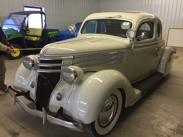 This is a beautiful 1936 Ford Deluxe Rumble Seat 5 Window Coupe with the VERY RARE “Pines Trim”. It has a 221 C.I. Flathead V-8 engine with a 3 speed manual transmission. It has an Offenhauser intake—Banjo steering wheel, Wind Wings, Dual spotlights and dual mirrors. Spare tire and cover. “In 1936, dual horns were added and were hidden behind the fenders”. Also new in ’36 was the ‘V’ shaped grill with vertical bars & brightwork around the headlight and the grill. It was the last year for the ‘free- standing’ headlights. The original color in ’36 was Tacoma Cream. In 1936 a Deluxe 5 window cost $555.