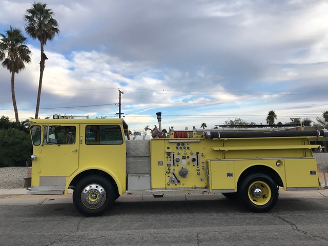 1973 American LaFrance Firetruck…runs great , diesel engine, working sirens. Was retired form the Crestline Forest Fire Protection District and includes the original map of the area served. San Bernardino County was contracted in 2013 to serve Crestline’s 23 square mile jurisdiction. Low reserve. Take a photo inside the firetruck next to Sparky the Dalmation anytime prior to it’s auction on Sunday. *** On Friday there will be exhibitions between 9 and 11am of it’s potential since it’s retirement from firefighting! - Makes a great workout facility for TRX weight suspension bands since it has solid metal bars that are very sturdy, would also make an excellent piece of playground equipment. Check out the modern cubistic lines which distinguish this vehicle from your average firetruck and make it so perfect for the midcentury haven of Palm Springs. It has hosted a neighborhood pub crawl and has enough space to set up bistro table and chairs for intimate, unique dinner parties.