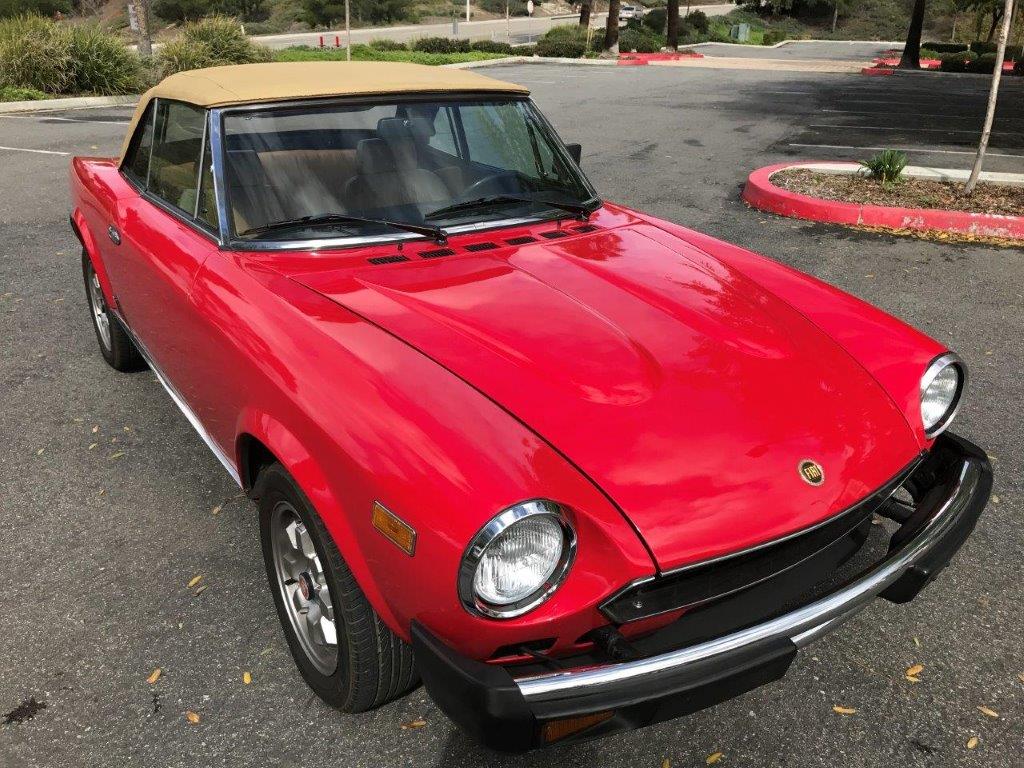 This 1981 Fiat Spider is one of 4747 produced for 1981 and has been with the seller for four years and 4500 miles. The 2.0l DOHC inline for was originally a turbo but that setup was removed and the car is mated to a 5 speed manual. The car last passed California smog in May 2017 and services completed in 2016-2017 include an inspection of electrics and lighting, new parking brake cables and adjustment, new battery and trickle charger adapters and changed fluids. A repaint was completed at an unknown date and the seller notes minor bubbling near the front of both doors and at the edges of both rear wheel arches as shown in the gallery. Exterior lighting is described as working, the glass has no cracks or delamination, and the window seals show no cracking or missing pieces. 14" Cromodora CD-134 alloys were original equipment for this limited production Fiat Turbo. Westlake SP06 tires are mounted all around. Brightwork has been replaced by the current owner. Rear quarter window frames show some corrosion. Front seats were reupholstered by a prior owner and the seller has had the rear seat dyed. Sun visors, door panels, center console and the ash tray are all replacement items. Tan carpets show no stains or excessive wear and front foot wells have black Pininfarina logo mats. All gauges and dash indicator lights work as intended. The turbo boost gauge has been removed and in its position sits a clock. The six digit odometer shows just over 63,000 miles which are believed accurate. Receipts for repair and maintenance from 2014 to 2017 total $8600.00, including a new starter in 2015. Service performed in February 2014 include: Head machined; turbo removed, fuel injectors rebuilt (new fuel filter); new distributor advance unit/springs, vacuum lines, EFI temp sensor; new auxiliary air valve, brake booster, front pulley seal; new motor mounts; front brake service; new master cylinder, reservoir, hoses, front/rear stainless brake lines; new radiator, thermostat, coolant hoses, clamps, coolant (car has no overheating issues); new exhaust and heat shield.