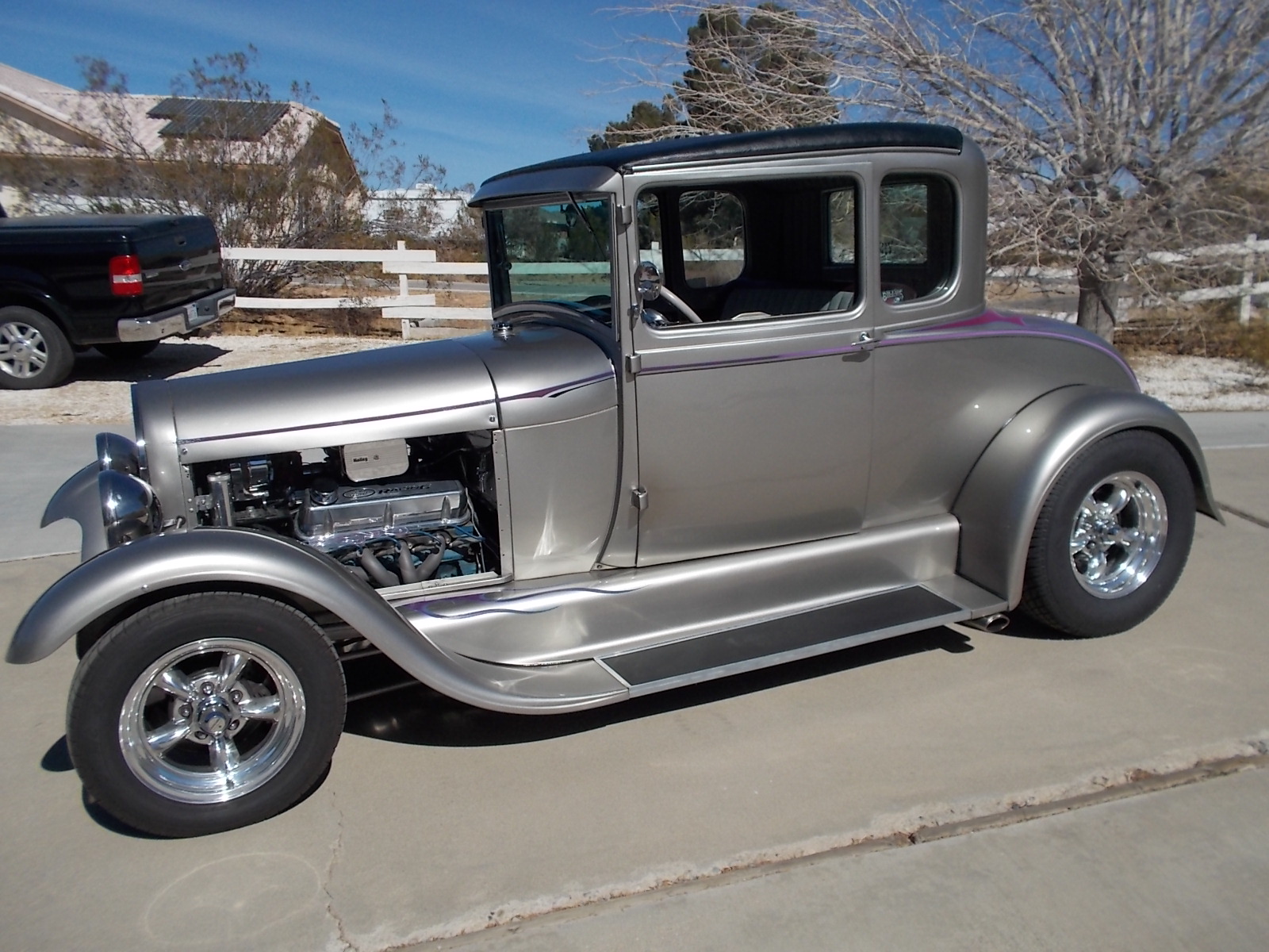 THIS ORIGINAL STEEL 1928 MODEL A WAS TRANSFORMED INTO A HOT ROD 1800 MILES AGO. THE FRAME, HOOD & RUNNING BOARDS WERE EXTENDED 6", IT HAS A 4 BAR WITH TRACK BAR AND COIL OVERS IN THE REAR, CROSS SPRING & DROPPED SOLID AXLE IN THE FRONT, C6 TRANS, 9" FORD REAR END, COLD A/C, REBUILT 302 FORD ENGINE, EDELBROCK MANIFOLD, HOLLEY CARB & AIR CLEANER, HEADERS, SIDE EXITS & FORD CHROMED VALVE COVERS. THE CAR WAS ENTERED IN THE ROUTE 66 FUN RUN IN MAY 2018.