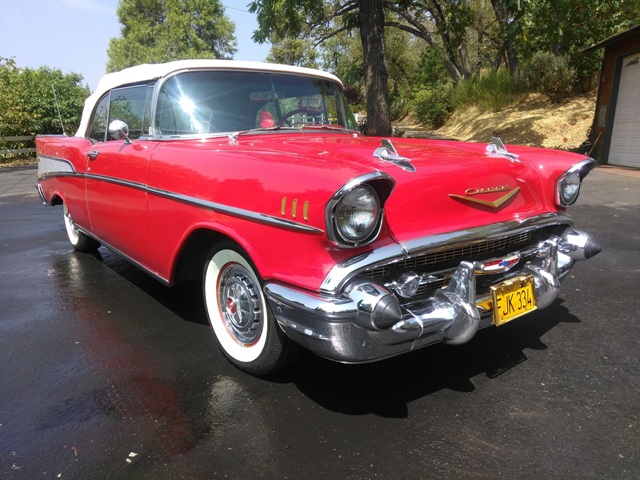1957 CHEVROLET BEL AIR CONVERTIBLE...Original California Drop Top! Matching 283 V-8 Power Pack Engine, Automatic transmission. Power Steering and Brakes, Power Top. Gorgeous and correct "Matador Red" Exterior, Factory stock Interior, Beautiful Chrome and Stainless. Laser Straight body. Very dependable and Drives like new.