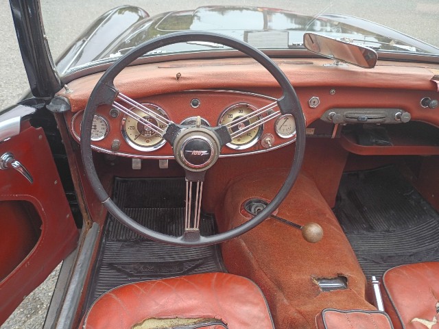 This is a rare find... An unadulterated, very original, 1959 Austin Healey 100- 6 BN6. This vehicle still has the original carpeting and interior. Although the certified factory record states black for the exterior colour, the green paint appears original as well and was a very quality job when applied. The only obvious modification is the addition of a new stainless steel exhaust system that is visible below the driver's side door. This is a fun car! Turn the key, push the start button and the engine fires up and runs smooth. The gearbox is smooth and shifts well through all the gears. The brakes are strong and have been recently serviced. Overall, this 1959 Austin Healey 100/6 is a great road vehicle. While it has not been licensed since 1978, it is obvious the previous owner took care of the car and exercised it with some regularity.