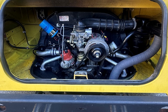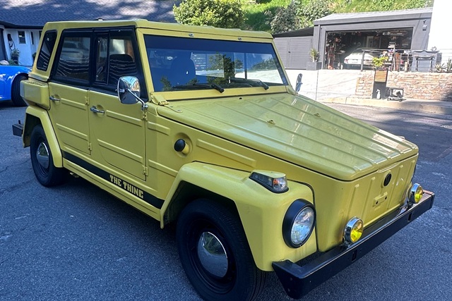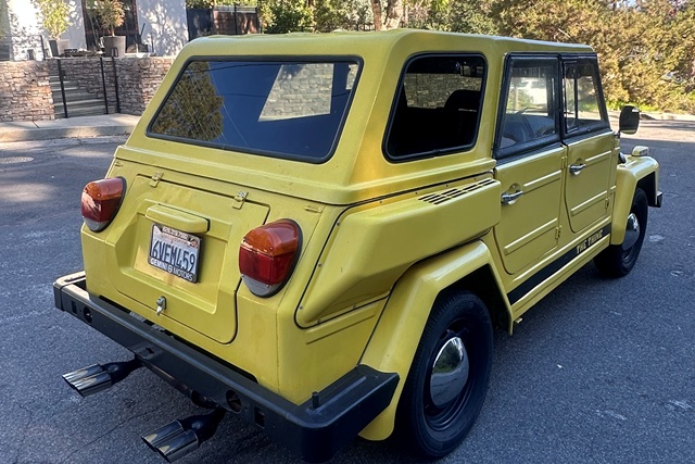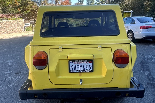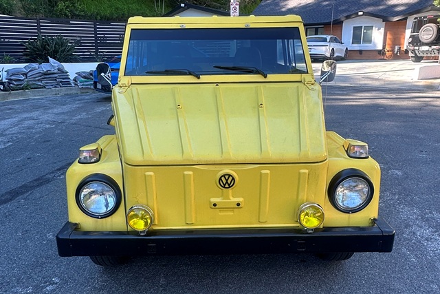 This 1974 VW Thing is in excellent original condition and has been enhanced with several tasteful upgrades including a rare fiberglass removable hard top, velour adjustable bucket seats, am/fm/bluetooth stereo, Grant steering wheel, analogue tachometer, yellow driving/fog lamps, custom pebble grain floor and trunk mats and magnetic cup holders. It has a fresh tune up including a new starter, carburetor, Monza style exhaust and electronic ignition.