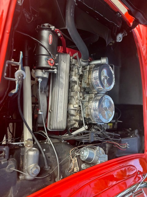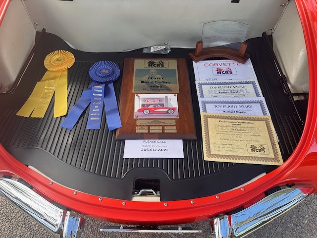 This 1956 Chevrolet Corvette is powered by its matching-numbers 265/225hp V8 engine with dual 4-barrel carburetors, paired with the original 3-speed manual transmission. It has earned multiple NCRS honors, including the Duntov Mark of Excellence, an NCRS Top Flight Award in April 2005 and an NCRS Performance Verification Award in June 2005. Equipment includes factory radio delete and heater delete options, and it is one of 547 Corvettes produced in 1956 with power windows. A power- operated convertible top is also fitted. During the restoration, each original component and accessory was individually restored, and the original brightwork was either preserved or protessionally restored. The interior and convertible top were completed by John Kennedy with attention to factory-correct materials and patterns. The car retains its original glass and original headlights. Included with the vehicle are NCRS judging sheets and the original shock absorbers.