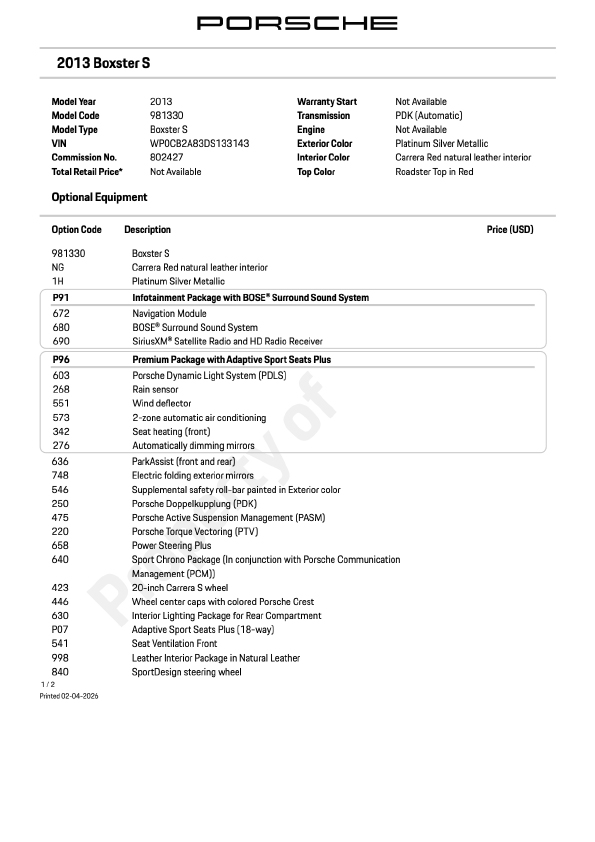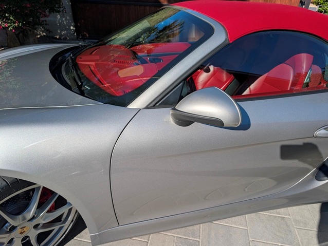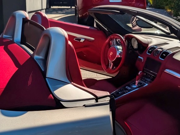Original one owner car with only 26,000 miles! The 2013 Boxster S was the last Porsche with Naturally aspirated flat 6 (sought after by enthusiasts). This stunning example has been garage kept, always in Palm Springs and has had all services performed. Classic Silver Metallic, Red interior and roof. Premium Package with Adaptive Sport Seats (18 way seats) Ventilated, heated and cooled seats Park assist front/rear Sport Steering Wheel with shift paddles Sport Chrono package Porsche Doppelkupplung (PDK) Porsche Active Suspension Management (PASM) Porsche Torque Vectoring (PTV) 20 inch Carrera S wheels Full Leather interior package in Natural Leather. Lo Jack installed. 26,180 miles on February 4, 2026 VIN WP0CB2AB3DS13343 All prior services were performed on time, records available. Car is due for Service based on time this year. Single original owner. No accidents or body damage.