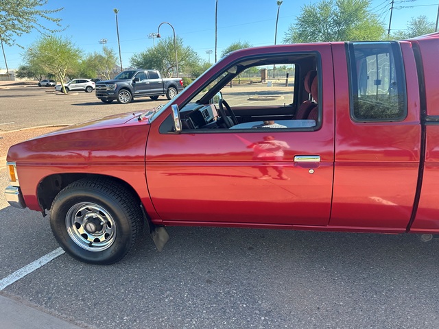 113k Miles Shown, 3.0-Liter VG30E V6, Four-Speed Automatic Transmission, Aztec Red Paint, Red Cloth Upholstery, Polished 14" Eight-Spoke Wheels, Power Steering, Front Disc Brakes, Double-Walled Bed, Bed Topper, Air Conditioning, Cruise Control, Cassette Stereo, Clean Carfax Report.
