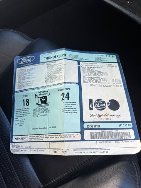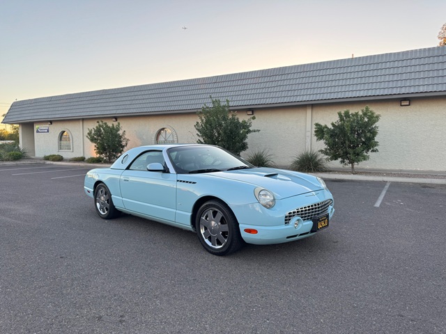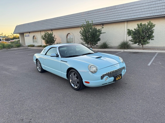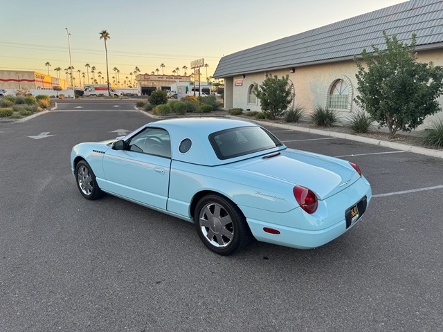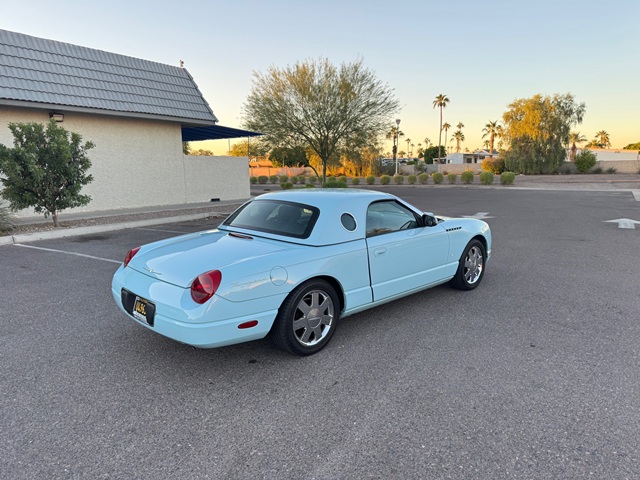 This 2003 ford thunder bird is powered by a 3.9 liter v8 engine backed by an automatic transmission. Rare limited production baby blue exterior . 2 top car with removable hard top and convertible soft top . Premium leather interior . Bucket seats with center console . Power windows and locks . Convenience package . Comfort package . Only 79000 actual miles . And rides on a set of thunderbird premium alloy wheels and tires. Original window sticker and maintenance records come with the vehicle.