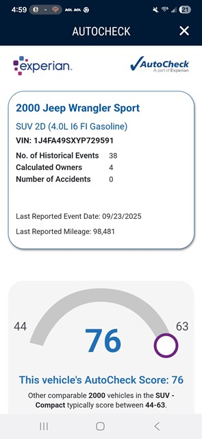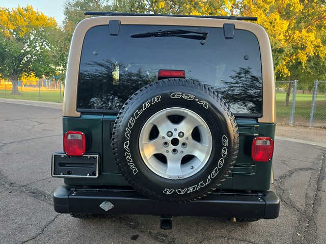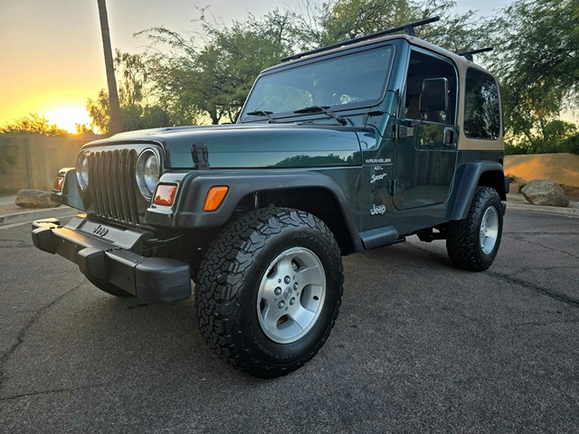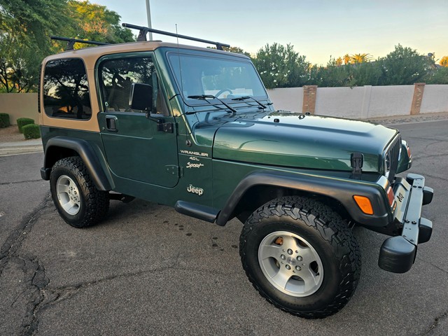 2000 Jeep Wrangler 2dr Sport "TJ" - 4.0 liter Inline 6 cylinder, 181 horsepower With 222 ft. Ib. of Torque. NV3550 5 Speed manual transmission, Four wheel drive with Command Trac NV231, With Dana 30 front and Dana 35 Rear, Removable Hardtop sport Package, Factory Air Conditioning, Power Steering, Power disc brakes, Tile wheel with cruise control, AM/FM/CD radio with roll bar mounted speakers, Deep tint glass, Factory 15" alloy wheels mounted on BFGoodrich All Terrain TA's 30x9.50R15LT. Original PG8 Forest Green exterior finish, Desert sand interior and hardtop trim finish, Receiver hitch tow package, Clean Autocheck and Carfax history. Rust free Southern California/Arizona "TJ" Wrangler Detailed and serviced in preparation for the new Owners